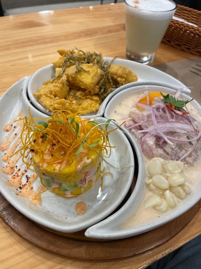 메뉴판을 펼치자마자 눈에 들어온 것은 바로 해산물 트리오였습니다. 사진 속 다채로운 색감과 신선함이 느껴지는 비주얼은 보는 것만으로도 입안에 침이 고이게 했습니다. 튀긴 생선, 세비체, 그리고 새우를 곁들인 카우사까지, 엘 트리덴테의 대표 메뉴들을 한 번에 맛볼 수 있다는 점이 매력적이었습니다.