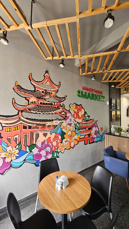 레스토랑 내부의 화려한 벽화, 일본풍 분위기를 더합니다.
