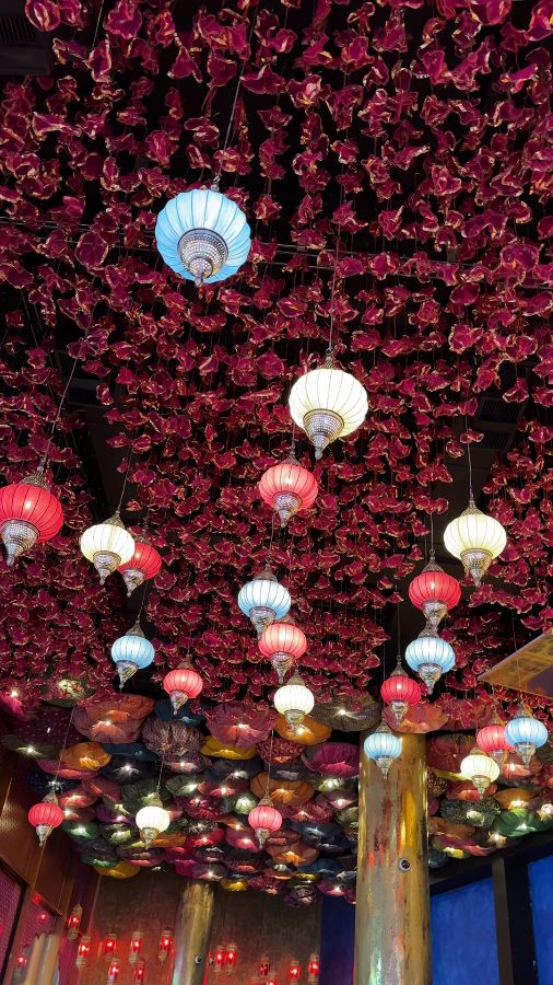 천장에 매달린 화려한 랜턴과 붉은색 꽃 장식이 어우러져 디왈리 축제 분위기를 한껏 고조시킨다.