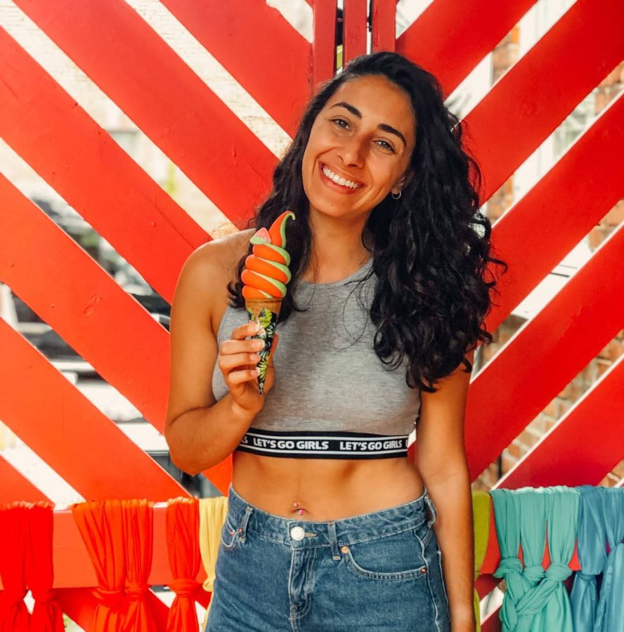 오렌지와 초록색으로 알록달록한 아이스크림을 들고 환하게 웃는 여성. 즐거운 디저트 시간을 보내고 있음을 보여준다.