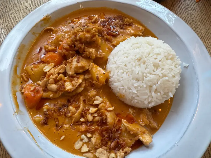 잠시 후, 김이 모락모락 나는 치킨 카레가 테이블에 놓였다. 짙은 오렌지색 카레 위로 코코넛 밀크가 부드럽게 퍼져 있었고, 잘 지어진 자스민 쌀밥이 한 켠에 자리 잡고 있었다. 카레에서는 은은한 코코넛 향과 함께, 향신료의 풍미가 느껴졌다.