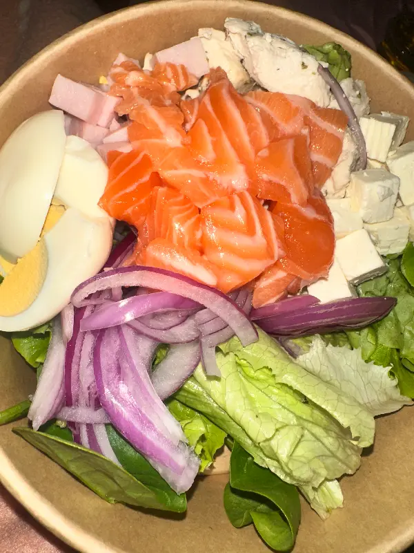 신선한 샐러드 재료들이 한가득 담겨 보기만 해도 건강해지는 느낌입니다. 연어의 선명한 주황색, 보라색 양파의 강렬한 색감이 식욕을 자극합니다.