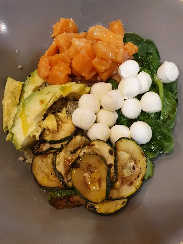 싱그러운 녹색 채소와 주황색 연어, 하얀색 모짜렐라 치즈의 조화는 보기만 해도 건강해지는 기분입니다. 아보카도의 부드러움과 구운 애호박의 담백함이 샐러드의 풍미를 더합니다.