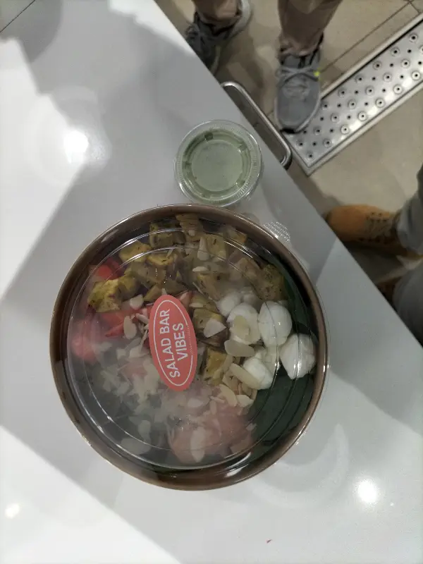 샐러드 포장 용기에 붙어있는 스티커는 ‘SALAD BAR VIBES’라는 문구로 ‘Obrigada Hortinha’의 활기찬 분위기를 잘 나타냅니다.