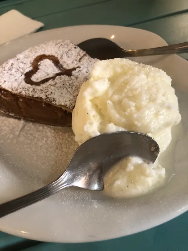 식사를 마치고, 디저트로 아펠슈트루델과 아이스크림을 주문했다. 따뜻한 아펠슈트루델 위에 슈가파우더가 솔솔 뿌려져 있고, 옆에는 차가운 바닐라 아이스크림이 놓여 있었다. 겉은 바삭하고 속은 촉촉한 아펠슈트루델은 달콤한 사과 향과 시나몬 향이 어우러져 환상적인 맛을 자랑했다. 차가운 아이스크림과 함께 먹으니, 입안에서 사르르 녹는 듯했다.