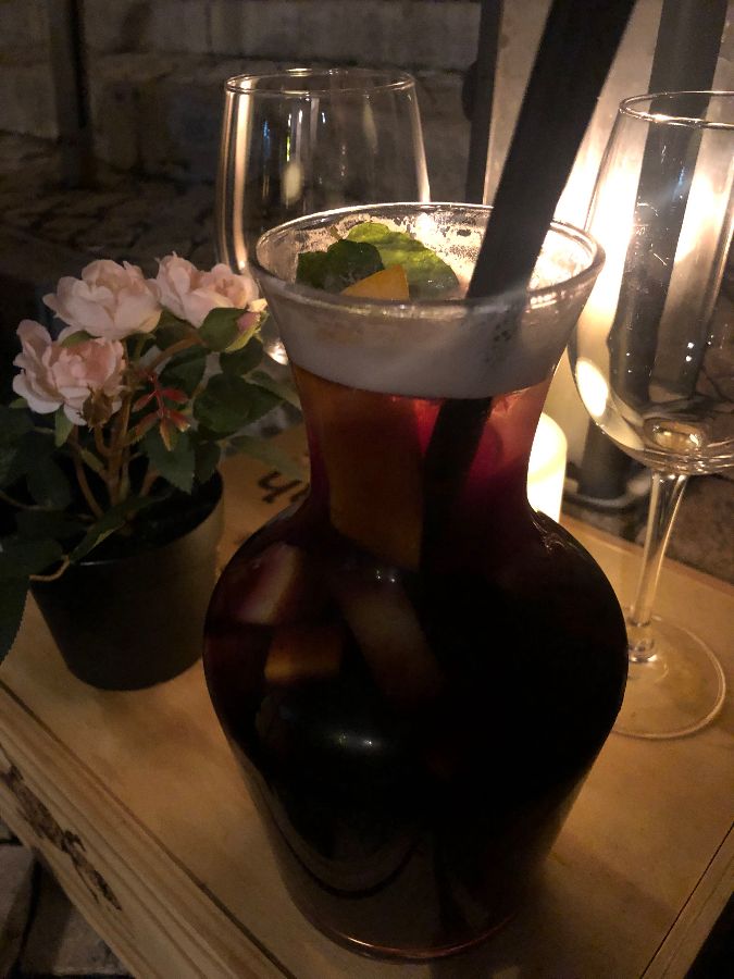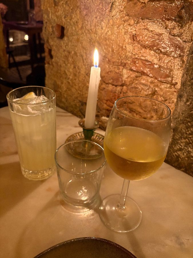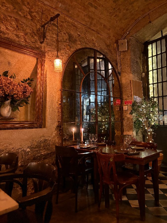 레스토랑 내부는 어두운 조명 덕분에 더욱 아늑하게 느껴졌습니다. 마치 오래된 와인 저장고에 들어온 듯한 기분이랄까요? 천장에 거미줄이 있다는 후기가 있었지만, 오히려 그런 자연스러운 모습이 이 공간의 매력을 더하는 듯했습니다. 벽돌로 마감된 벽과 나무 테이블, 은은하게 빛나는 촛불은 낭만적인 분위기를 자아냈습니다.
