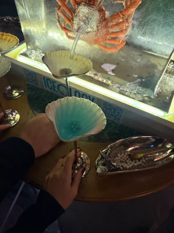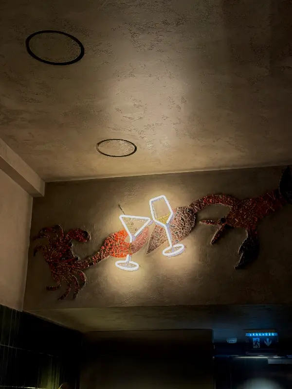 핀치는 규모는 작지만, 공간 곳곳에 세심한 손길이 느껴지는 곳이었다. 은은하게 빛나는 조명 아래, 편안하게 대화를 나눌 수 있도록 테이블 간 간격도 넉넉하게 배치되어 있었다. 벽면에는 감각적인 그림들이 걸려 있었고, 테이블 위에는 싱그러운 꽃들이 놓여 있었다. 마치 비밀스러운 아지트에 들어온 듯한 기분이었다. 천장에는 랍스터와 칵테일 잔이 빛나는 네온사인 장식이 시선을 사로잡는다. 핀치의 공간은 그 자체로 하나의 예술 작품이었다.