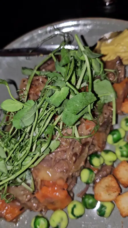 칼로 오리고기를 자르는 순간, 부드러운 육질이 그대로 느껴졌다. 입안에 넣으니, 촉촉하고 부드러운 식감과 함께 풍부한 육즙이 흘러나왔다. 오리고기 특유의 잡내는 전혀 느껴지지 않았고, 신선한 채소와 함께 먹으니 더욱 풍미가 살아났다. 겉은 바삭하고 속은 촉촉한 구운 감자와 달콤한 완두콩 또한 오리고기 요리와 완벽한 조화를 이루었다. 클란데스티노의 오리고기 요리는 단순한 안주가 아닌, 훌륭한 하나의 요리였다.