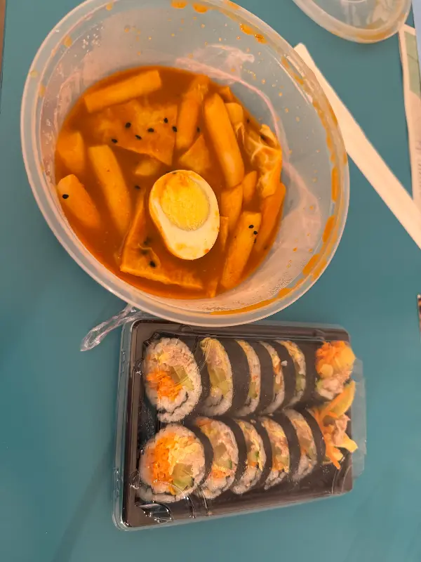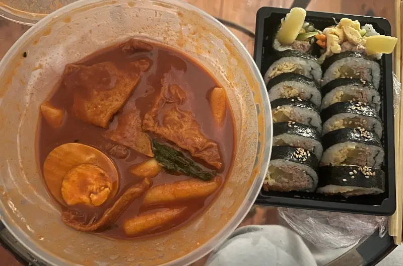 정갈하게 담긴 떡볶이와 김밥. 보기만 해도 배부르다.