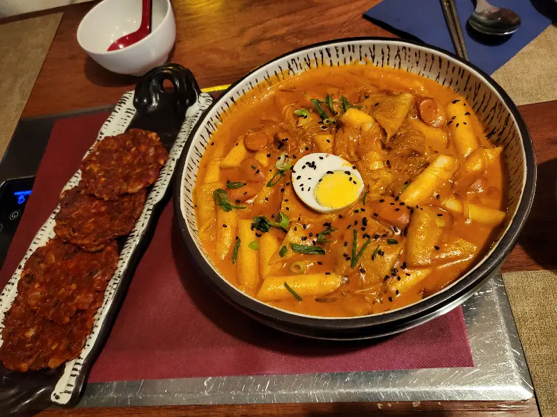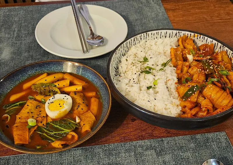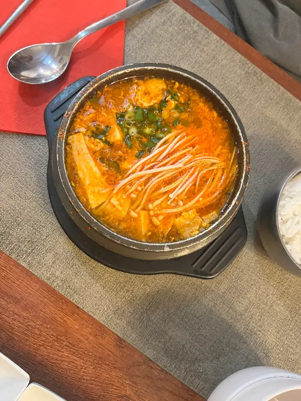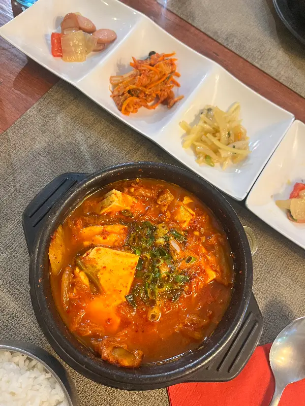 메뉴판을 펼쳐 들자, 익숙한 한식 메뉴들이 눈에 들어왔다. 김치찌개, 떡볶이, 잡채, 야채전, 짜장면, 두부조림… 하나하나 놓치고 싶지 않은 메뉴들 앞에서 고민에 빠졌다. 오랜 고민 끝에, 가장 그리웠던 김치찌개를 주문했다. 잠시 후, 테이블 위로 김이 모락모락 피어오르는 김치찌개가 놓였다. 붉은 국물 속에는 김치와 두부, 돼지고기가 듬뿍 들어 있었다.