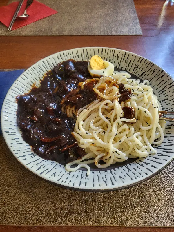 짜장면의 모습. 윤기가 흐르는 짜장 소스가 식욕을 자극한다.