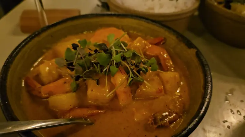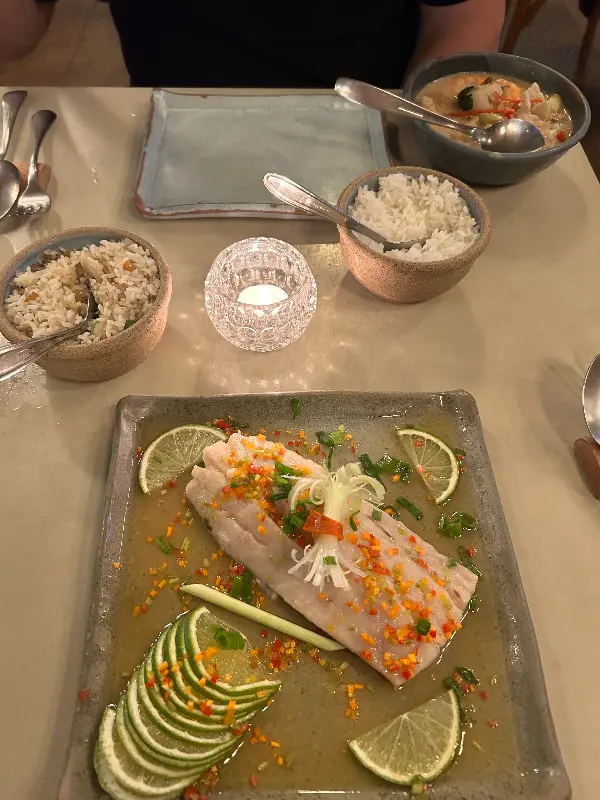 메인 요리 중 하나인 카오소이는 부드러운 면발과 매콤한 코코넛 커리가 어우러진 태국 북부 지방의 대표적인 음식이다. 한 입 맛보는 순간, 입안 가득 퍼지는 매콤함과 고소함, 그리고 은은한 단맛이 혀를 즐겁게 했다. 마치 실크처럼 부드러운 면발은 목넘김이 좋았고, 코코넛 커리는 깊고 풍부한 맛을 선사했다.