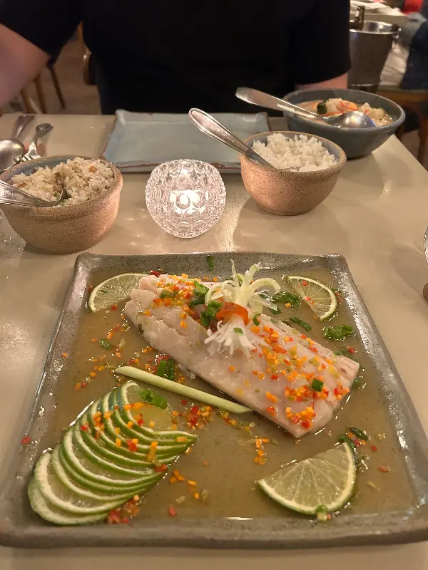 디저트로는 망고 찹쌀밥과 코코넛 아이스크림이 준비되었다. 달콤한 망고와 쫀득한 찹쌀밥의 조합은 환상적이었다. 코코넛 아이스크림은 부드럽고 시원했으며, 입안을 깔끔하게 마무리해 주었다. 디저트까지 완벽한 남 타이 레스토랑에서의 식사는 오랫동안 기억에 남을 것 같다.