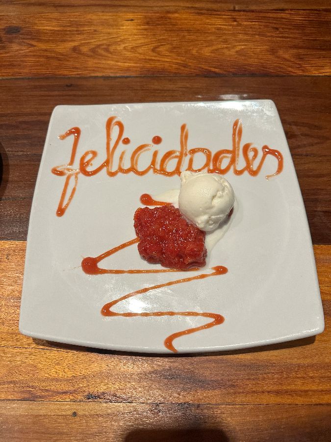 식사를 마치고 디저트로 치즈 아이스크림을 곁들인 구아바 페이스트를 주문했습니다. 달콤한 구아바와 부드러운 치즈 아이스크림의 조합은 완벽한 마무리를 선사했습니다. 마지막으로 따뜻한 커피와 작은 쿠키까지 곁들이니 더할 나위 없이 행복했습니다.
