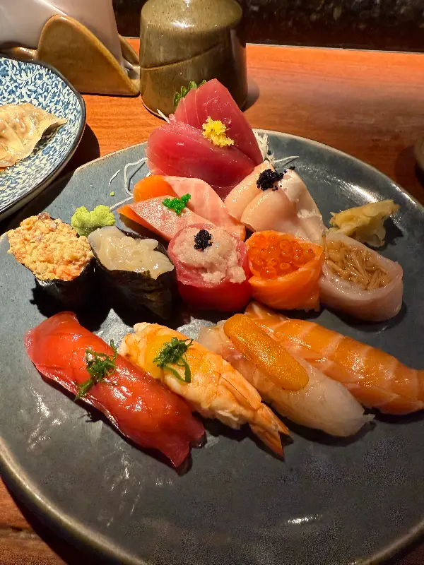 다음으로 맛본 것은 참치 스시였습니다. 붉은 빛깔의 참치는 쫄깃하면서도 부드러운 식감을 자랑했습니다. 신선한 참치 특유의 풍미가 입안 가득 퍼져 나갔습니다. 콤비네이션 메뉴는 전체적으로 맛은 있었지만, 조금 반복적인 느낌이 들었습니다. 다음에는 라멘이나 돈까스 등 다른 메뉴도 맛봐야겠다는 생각이 들었습니다. 곁들여 주문한 교자는 겉은 바삭하고 속은 촉촉하여, 스시와 함께 즐기기에 완벽했습니다. Image 4에서 보이는 것처럼, 예쁜 접시에 담겨 나온 교자는 시각적인 즐거움도 더했습니다.