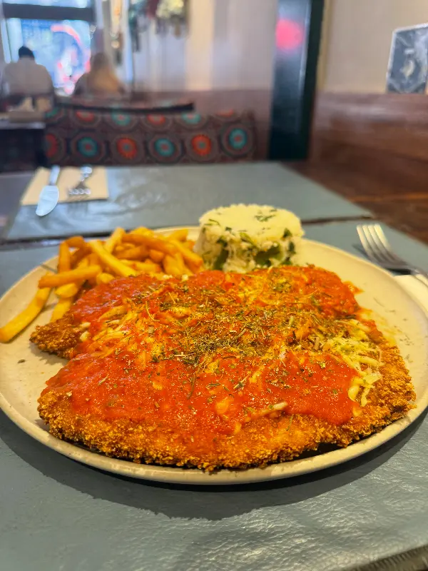 페이조아다 외에도 코르티소 카리오카에는 다양한 메뉴가 준비되어 있습니다. 특히, 치킨 파르메산(Chicken Parmigiana)은 많은 사람들에게 사랑받는 메뉴 중 하나입니다. 바삭하게 튀겨진 닭고기 위에 토마토 소스와 치즈를 듬뿍 얹어 오븐에 구워낸 치킨 파르메산은, 겉은 바삭하고 속은 촉촉한 식감이 일품입니다. 감자튀김과 샐러드와 함께 제공되어 푸짐하게 즐길 수 있습니다.