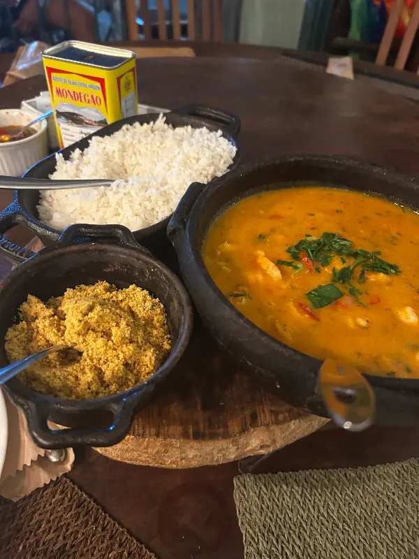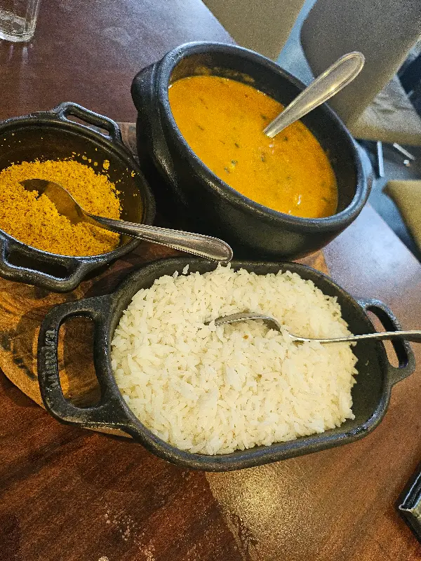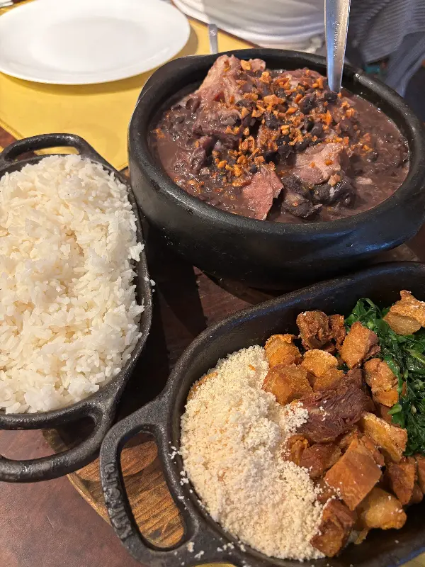 잠시 후, 기다리고 기다리던 페이조아다가 테이블에 놓였습니다. 검은콩과 다양한 부위의 돼지고기를 푹 끓여낸 브라질 대표 음식인 페이조아다는, 푸짐한 양에 먼저 놀랐습니다. 윤기가 자르르 흐르는 검은콩 스튜는 보기만 해도 군침이 돌았습니다. 함께 제공된 밥, 야채, 그리고 곁들임 음식들은 페이조아다를 더욱 풍성하게 만들어주었습니다. 첫 입을 입에 넣는 순간, 깊고 진한 풍미가 입안 가득 퍼져나갔습니다. 돼지고기는 부드럽게 녹아내렸고, 검은콩은 고소하면서도 담백했습니다. 밥과 함께 먹으니 든든했고, 야채와 함께 먹으니 신선함이 더해졌습니다.