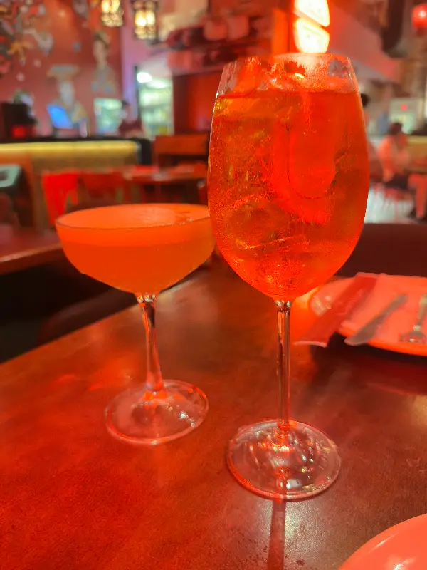 붉은 조명 아래 더욱 매혹적으로 빛나는 칵테일. 아페롤 스프리츠의 상큼함이 느껴진다.