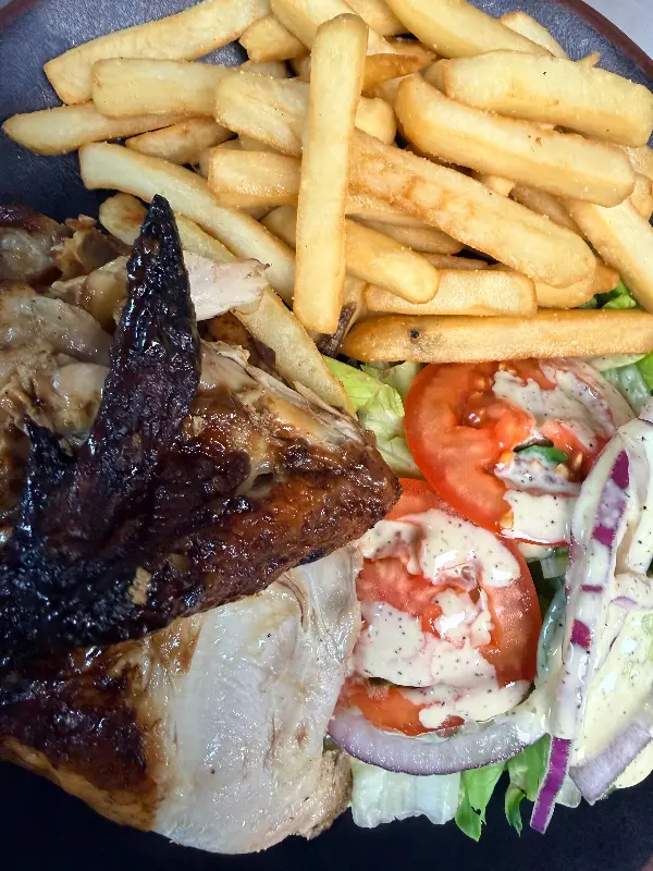 폴로 아 라 브라사는 겉은 바삭하고 속은 촉촉한 닭고기의 풍미가 일품인 메뉴입니다. 닭 껍질은 바삭하게 구워져 고소한 풍미를 더하고, 속살은 촉촉함을 유지하여 부드러운 식감을 자랑하죠. 닭고기 자체의 맛도 훌륭했지만, 함께 제공되는 소스 또한 폴로 아 라 브라사의 매력을 한층 더 끌어올렸습니다. 닭고기를 소스에 찍어 한 입 베어 물면, 입안 가득 퍼지는 풍미에 저절로 미소가 지어졌습니다. 곁들여 나온 토마토와 양상추는 신선함을 더해주었고, 볶음밥과의 조화도 훌륭했습니다.