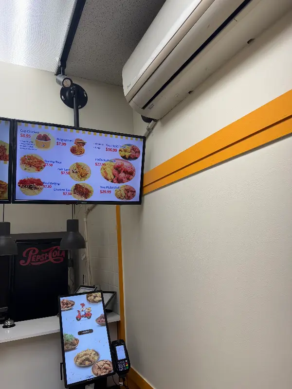 메뉴판을 살펴보니 시그니처 메뉴인 ‘불닭’부터 ‘허니 BBQ’, ‘치즈스노맛’ 등 다채로운 맛의 치킨들이 준비되어 있었다. 닭고기 종류도 뼈 있는 치킨과 뼈 없는 치킨 중 선택할 수 있다는 점이 매력적이었다. 주문 후 10분 정도 기다려야 한다는 안내에 잠시 주변을 둘러봤다. 벽에 붙은 노란색 포인트 라인이 눈에 띄고, 깔끔하게 정돈된 주방에서는 맛있는 치킨 냄새가 솔솔 풍겨왔다.