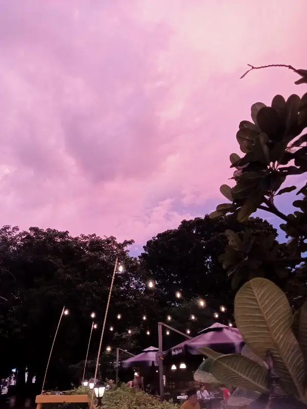 분홍빛으로 물든 하늘과 야외 테이블 위 조명이 어우러져 낭만적인 분위기를 자아낸다.
