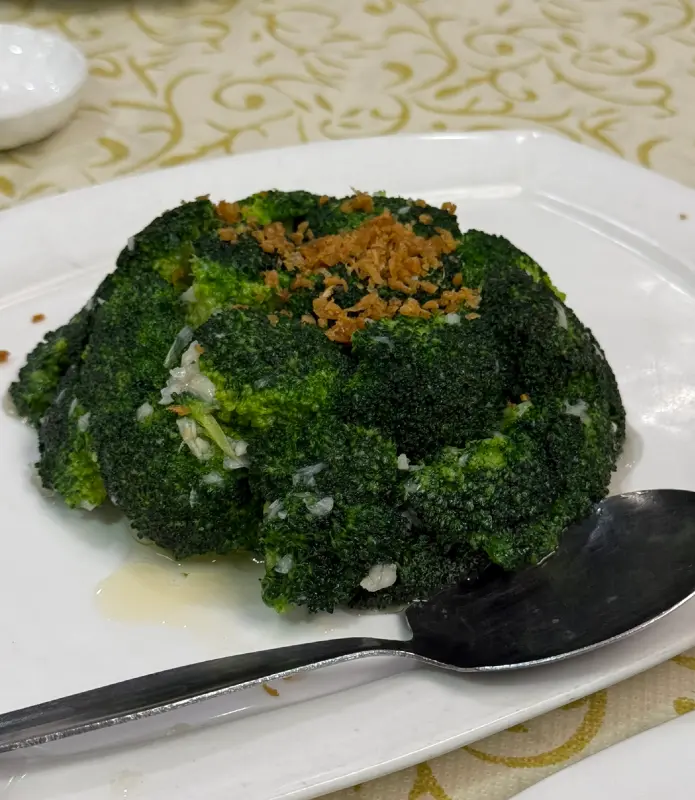 이어서 브로콜리 볶음이 나왔다. 접시 가득 담긴 브로콜리는 윤기가 자르르 흘렀고, 위에는 바삭한 마늘 후레이크가 뿌려져 있었다. 신선하고 아삭한 브로콜리의 식감과 고소한 마늘 향이 어우러져, 젓가락을 멈출 수 없게 만들었다. 사진 속 브로콜리의 선명한 초록색은 신선함을 그대로 보여주는 듯했다.