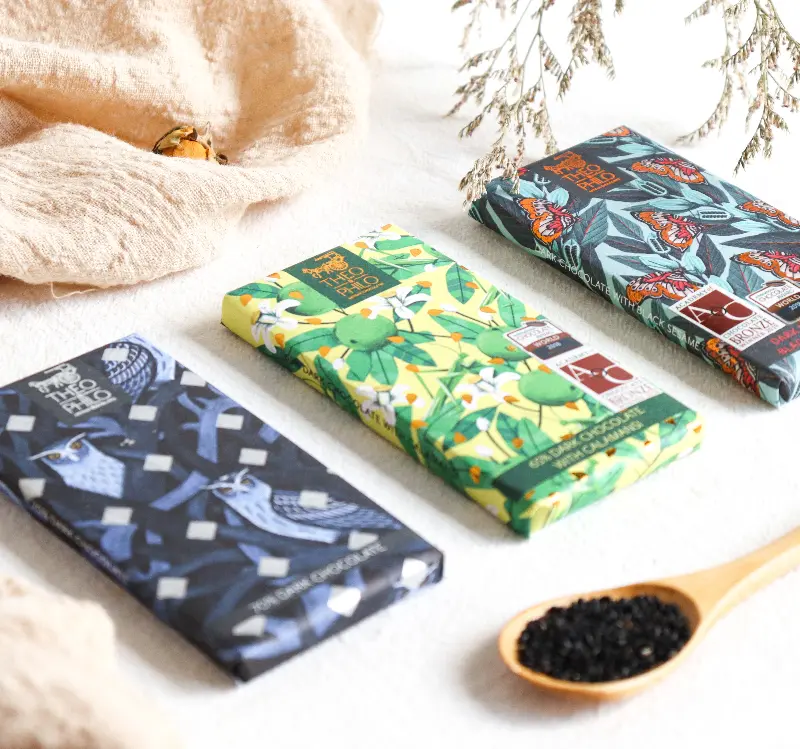 테오앤필로의 초콜릿은 맛과 향뿐만 아니라, 시각적인 즐거움까지 선사합니다. 아름다운 패키지 디자인은 선물용으로도 손색이 없습니다.