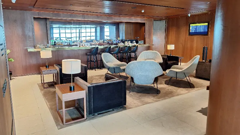 라운지는 넓고 조용하며, 좌석 간 간격도 넓어 편안하게 휴식을 취할 수 있습니다. 짙은 갈색을 주조색으로 사용한 인테리어는 차분하고 따뜻한 느낌을 주며, 은은한 조명은 눈의 피로를 덜어줍니다.