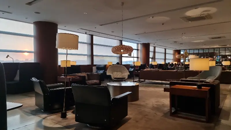 라운지 곳곳에 놓인 스탠드 조명은 부드러운 빛을 발하며 공간에 따뜻함을 더하고, 창밖으로는 활주로가 한눈에 들어와 비행기를 구경하는 재미도 쏠쏠합니다. 특히, 해질녘 활주로를 붉게 물들이는 석양은 그야말로 장관입니다.