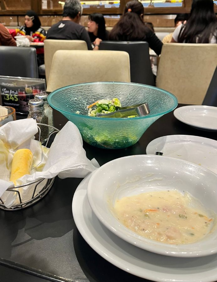올리브 가든의 또 다른 매력은 바로 뛰어난 가성비입니다. 저희는 무제한 수프, 샐러드, 브레드 스틱을 포함한 세트 메뉴를 495페소(한화 약 12,000원)에 즐길 수 있었습니다. 이 가격에 이렇게 푸짐하고 맛있는 음식을 즐길 수 있다는 사실에 놀라움을 금치 못했죠. 특히 샐러드와 브레드 스틱을 무제한으로 제공한다는 점이 정말 마음에 들었습니다. 덕분에 배부르고 만족스러운 식사를 할 수 있었죠.