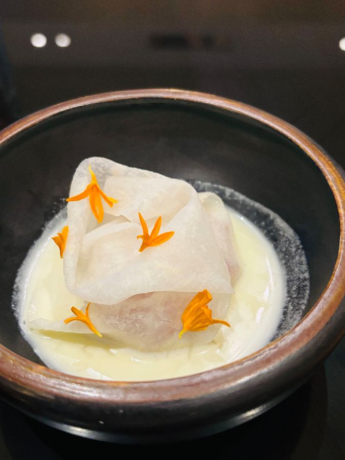 또한, 이곳에서는 독특하고 아름다운 디저트도 맛볼 수 있습니다. 흰색의 얇은 층으로 덮여 있고 오렌지색 꽃잎으로 장식된 섬세한 디저트는 맛뿐만 아니라 시각적으로도 예술 작품과 같습니다. 부드러운 크림 소스와 어우러져 입안에서 사르르 녹는 맛은 잊을 수 없는 경험을 선사합니다. 이러한 디저트들은 식사의 마지막을 완벽하게 장식하며, 기분 좋은 여운을 남깁니다.