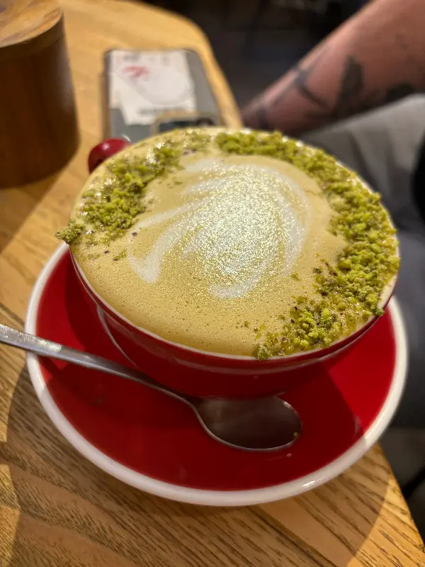 따뜻한 피스타치오 라떼. 부드러운 우유 거품과 피스타치오의 조화가 일품이다.