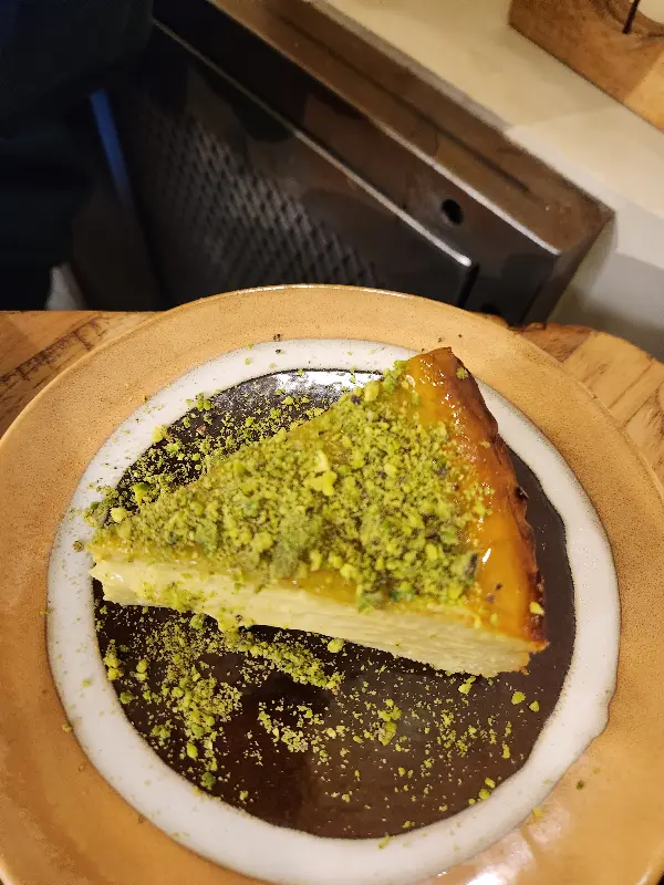피스타치오 가루가 듬뿍 뿌려진 치즈케이크. 커피와 환상적인 궁합을 자랑한다.