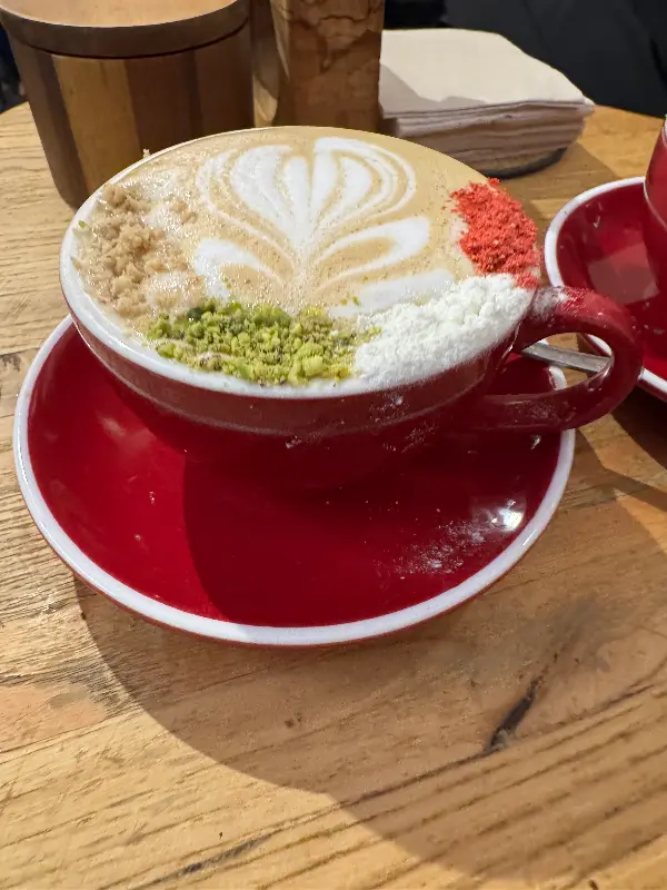 나지의 대표 메뉴는 단연 피스타치오 라떼다. 스페인 여행 중 맛본 피스타치오 젤라또의 황홀한 맛을 잊지 못해, 이곳에서도 피스타치오 라떼를 주문했다. 따뜻한 라떼를 한 모금 마시는 순간, 입안 가득 퍼지는 고소한 피스타치오 향과 부드러운 우유의 조화는 그야말로 환상적이었다.
