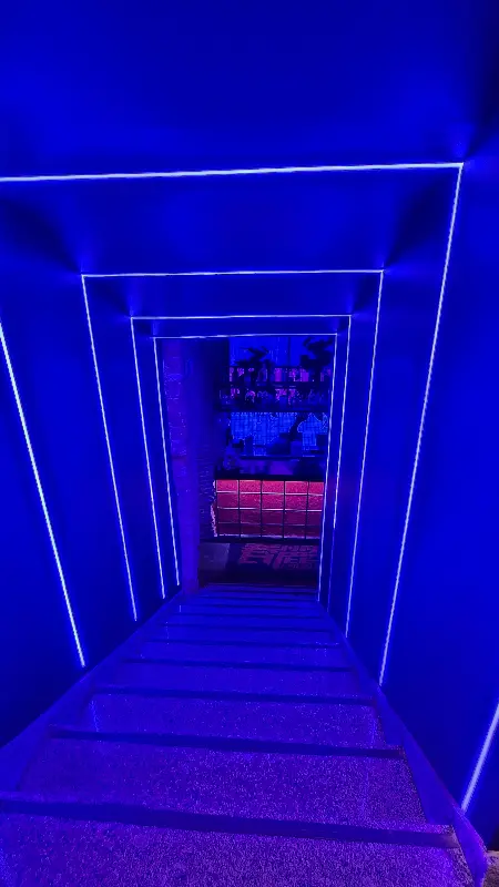 춘리에 들어서자마자 가장 먼저 눈에 띈 것은 강렬한 푸른색 조명이었다. 마치 다른 세계로 통하는 듯한 착각을 불러일으키는 신비로운 분위기였다. 네온사인으로 장식된 통로를 따라 내려가는 동안, 쿵쾅거리는 음악 소리가 점점 커져왔다.