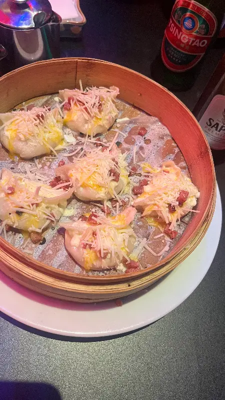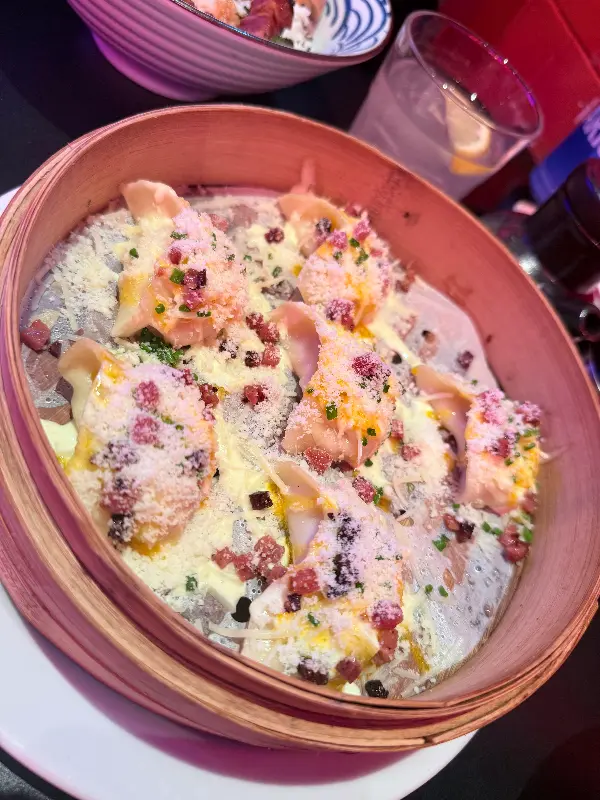 가장 먼저 등장한 ‘까르보나라 교자’는 비주얼부터 압도적이었다. 나무 찜기에 담겨 나온 교자 위에는 하얀 치즈 가루와 베이컨 조각, 파슬리가 흩뿌려져 있었다. 마치 고급 레스토랑의 파스타를 연상시키는 화려한 모습이었다.