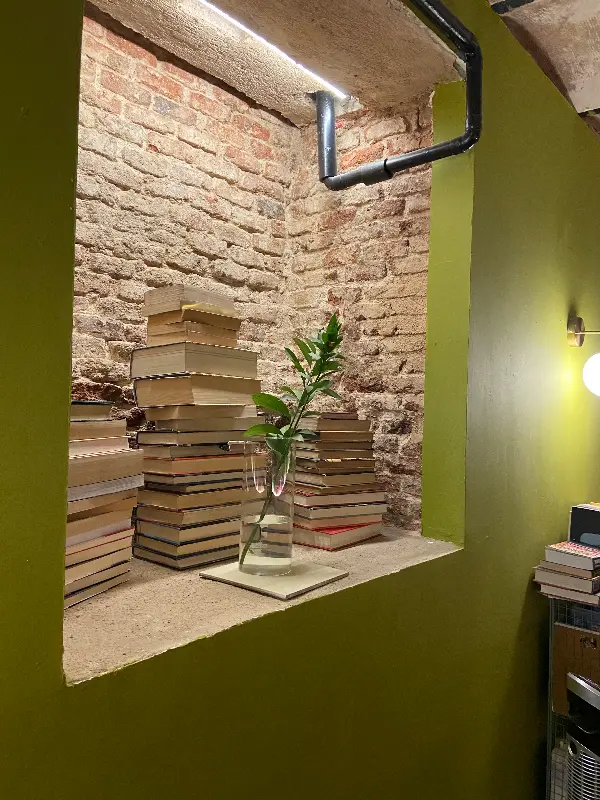 J&J는 들어서는 순간 시선을 사로잡는 독특한 인테리어를 자랑합니다. 벽돌 벽에는 책들이 켜켜이 쌓여 있고, 은은한 조명이 공간을 부드럽게 감싸 안습니다.