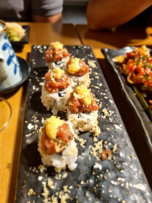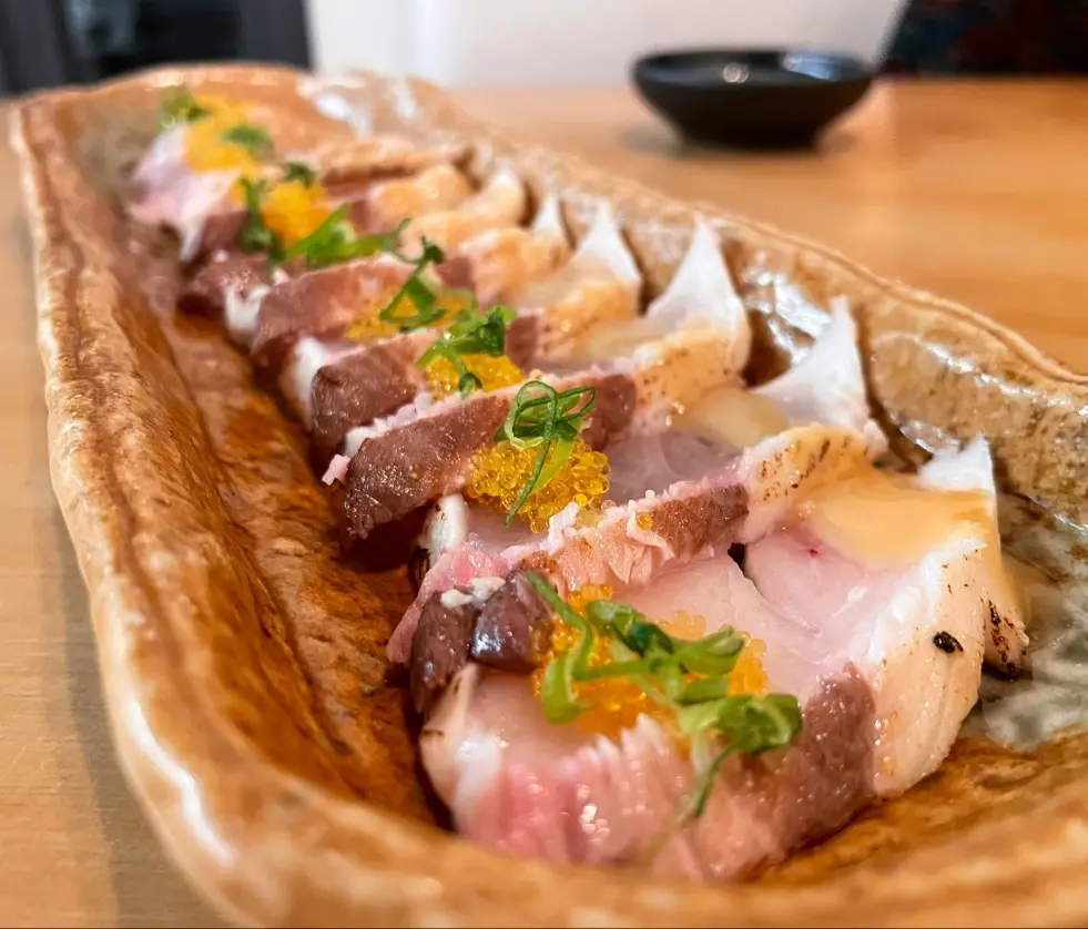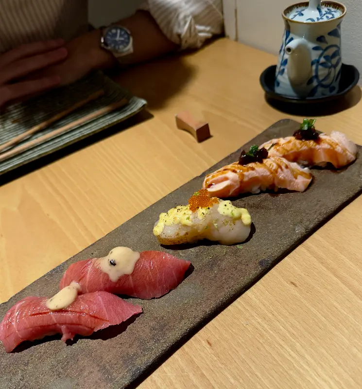 첫 번째 메뉴는 덴푸라였다. 갓 튀겨져 나온 덴푸라는 바삭한 튀김옷과 신선한 채소의 조화가 일품이었다. 특히 튀김옷이 전혀 기름지지 않고, 채소 본연의 풍미를 그대로 느낄 수 있어서 좋았다. 다음으로 맛본 메뉴는 플랑베 트러플 니기리. 부드러운 밥 위에 신선한 참치, 그리고 향긋한 트러플 오일의 조합은 정말 환상적이었다. 입안에 넣는 순간, 트러플 향이 은은하게 퍼지면서 참치의 풍미를 더욱 깊게 만들어준다. 이곳의 니기리는 정말 특별하다.