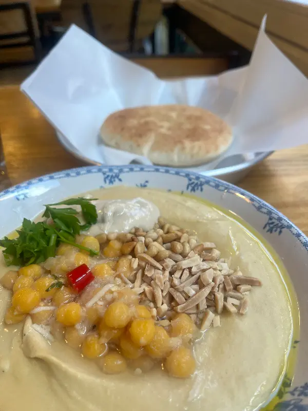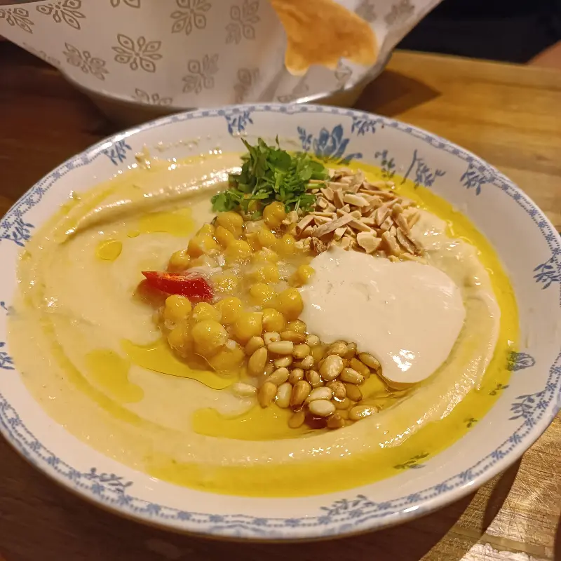 아몬드와 잣을 곁들인 특별한 후무스, 따뜻한 빵과 함께 먹으니 환상의 궁합을 자랑했습니다.