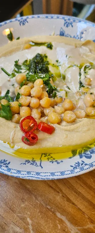 이곳의 대표 메뉴인 후무스는 왜 많은 사람들이 극찬하는지 단번에 알 수 있었다. 부드럽고 크리미한 질감의 후무스는 입에 넣는 순간 사르르 녹아내리는 듯했다. 특히 아몬드와 잣을 곁들인 후무스는 고소한 풍미를 더해, 빵과 함께 먹으니 그 맛이 배가 되었다. 갓 구워져 나온 따뜻한 빵은 겉은 바삭하고 속은 촉촉해, 후무스와 완벽한 조화를 이루었다. 빵 위에 후무스를 듬뿍 올려 한 입 베어 물면, 입안 가득 퍼지는 행복감에 저절로 미소가 지어졌다.