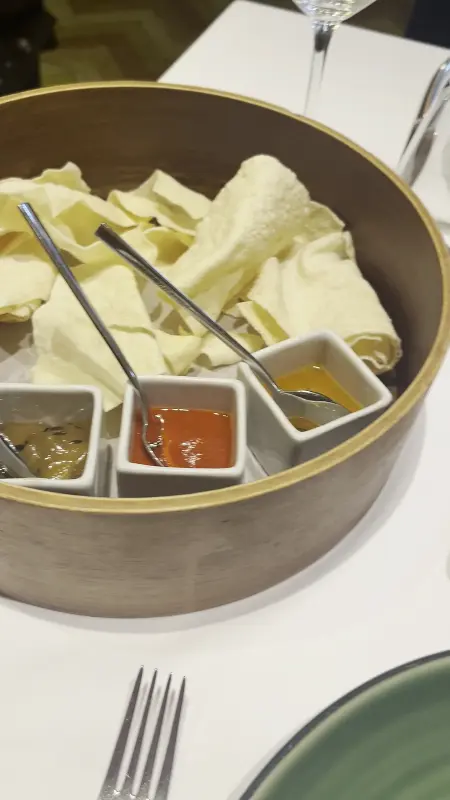 다음으로 나온 것은 파파담이었습니다. 얇고 바삭한 식감은 물론, 묘하게 끌리는 독특한 향신료의 조화가 인상적이었습니다. 마치 비밀 레시피가 숨겨져 있는 듯한, 쉽게 흉내 낼 수 없는 특별한 맛이었습니다. 짭짤하면서도 고소한 맛은 멈출 수 없는 중독성을 불러일으켰습니다.