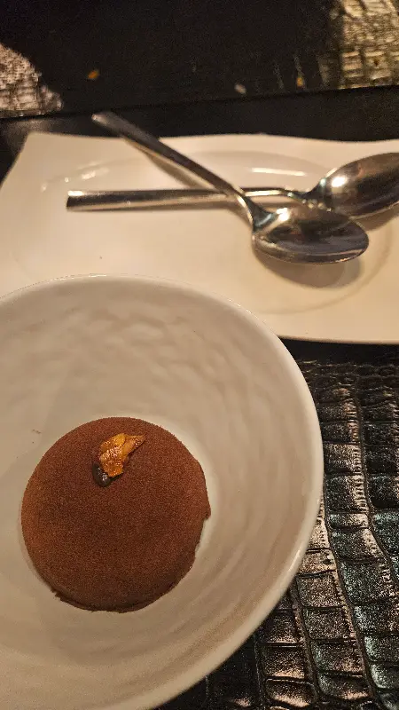 식사를 마치고 디저트로 초콜릿 돔을 주문했다. 동그란 초콜릿 돔 위에 초콜릿 가루가 뿌려져 있었고, 안에는 부드러운 크림과 과일이 들어 있었다. 달콤하면서도 상큼한 맛이 입안을 즐겁게 했다.