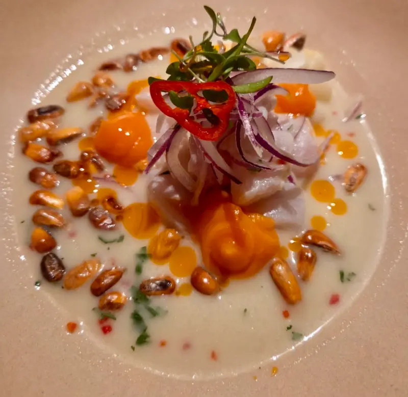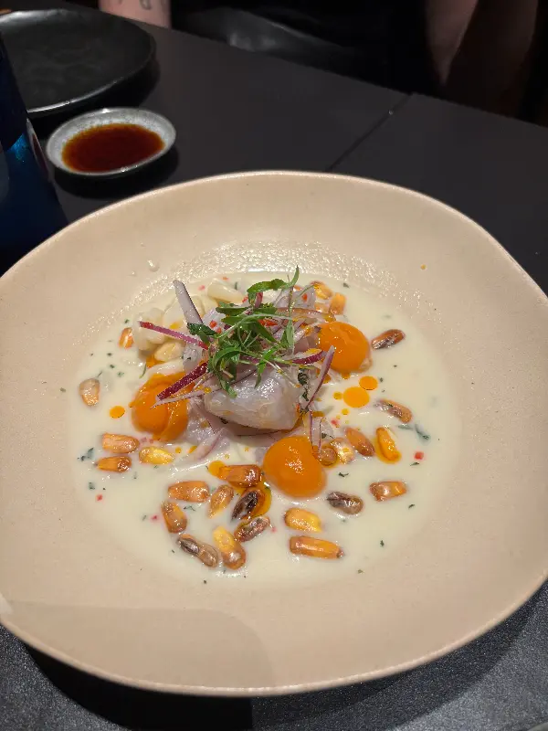 가장 먼저 눈에 들어온 것은 세비체였다. 싱그러운 초록색 허브와 붉은 고추, 자주색 양파가 흰 살 생선 위에 흩뿌려져 시각적인 아름다움을 뽐냈다. 뽀얀 우유 빛깔의 소스는 부드러움을 더하고, 톡톡 터지는 옥수수는 식감을 자극했다. 한 입 맛보니 신선한 해산물의 풍미와 상큼한 소스가 어우러져 입안 가득 퍼져 나갔다.