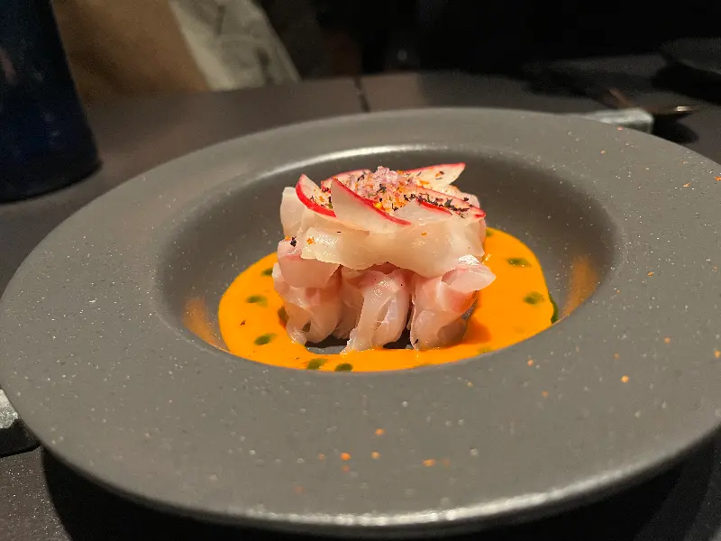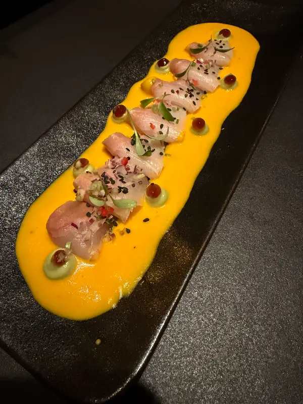 또 다른 요리는 길쭉한 검은색 접시 위에 황금빛 소스가 넓게 펼쳐져 있고, 그 위에 가지런히 놓인 생선회였다. 검은깨와 허브가 섬세하게 뿌려져 있어 마치 예술 작품을 보는 듯했다. 입에 넣으니 부드러운 생선살이 사르르 녹아내리면서 고소한 풍미가 입안을 가득 채웠다. 달콤하면서도 톡 쏘는 듯한 소스는 생선회의 맛을 한층 더 끌어올렸다.