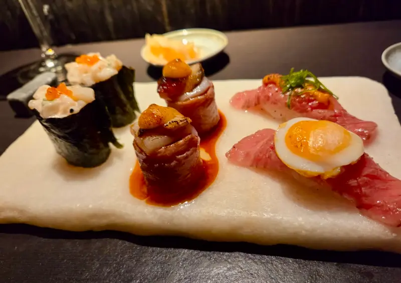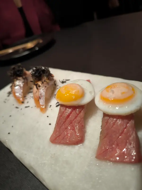 특히 인상적이었던 것은 니기리였다. 윤기가 흐르는 밥 위에 신선한 생선과 앙증맞은 메추리알이 올라가 있었다. 톡 터지는 노른자와 쫄깃한 생선, 그리고 고슬고슬한 밥알이 환상적인 조화를 이루었다. 폰자 니케이만의 특별한 소스가 더해져 풍미를 한층 더 끌어올렸다.