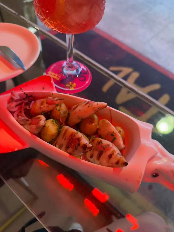 또 다른 인기 메뉴인 오징어 요리는 독특한 비주얼로 시선을 사로잡았다. 오징어 모양의 그릇에 담겨 나온 요리는 겉은 바삭하고 속은 촉촉한 완벽한 조화를 이루었다. 짭짤하면서도 고소한 맛은 맥주와 환상적인 궁합을 자랑했다. 함께 제공된 소스에 찍어 먹으니 풍미가 더욱 깊어졌다.