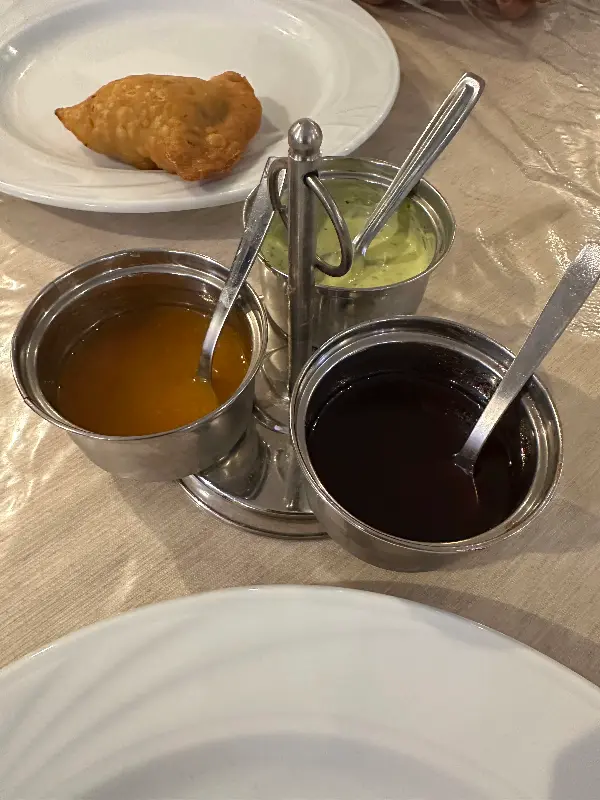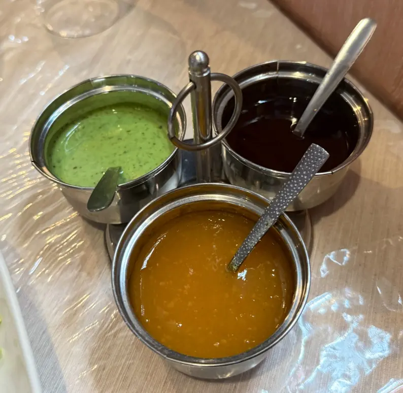 좀 더 다양한 인도 요리를 맛보고 싶어 세트 메뉴를 추가로 주문했다. 세트 메뉴는 알루 티키, 치즈 난, 필라프 라이스, 치킨 티카 마살라 등으로 구성되어 있었다. 알루 티키는 향신료를 넣은 렌틸콩과 감자를 튀긴 페이스트리였는데, 겉은 바삭하고 속은 촉촉했다. 튀긴 음식 특유의 느끼함은 처트니가 잡아주었다. 망고, 민트, 고수, 매콤한 맛 등 다양한 맛의 처트니가 준비되어 있어, 취향에 따라 알루 티키를 즐길 수 있었다.