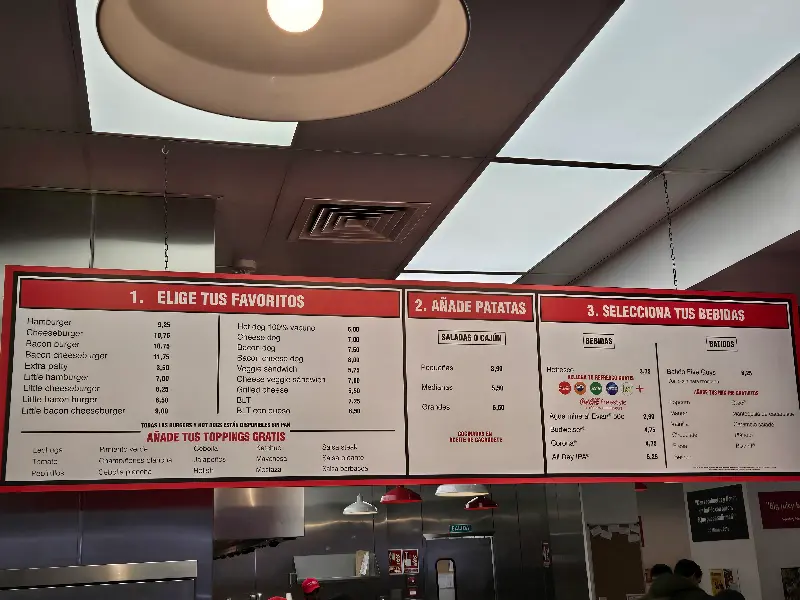 매장 안으로 들어서자 활기찬 분위기가 느껴졌다. 메뉴판을 보니 다양한 토핑을 내 마음대로 추가할 수 있는 시스템이었다. 스페인어로 적혀 있어 조금 당황했지만, 미리 알아보고 간 덕분에 어렵지 않게 주문할 수 있었다. ‘ELIGE TUS FAVORITOS’라는 문구 아래 나열된 다양한 토핑들을 하나하나 살펴보며 어떤 조합으로 나만의 버거를 만들지 고민하는 시간이 즐거웠다.