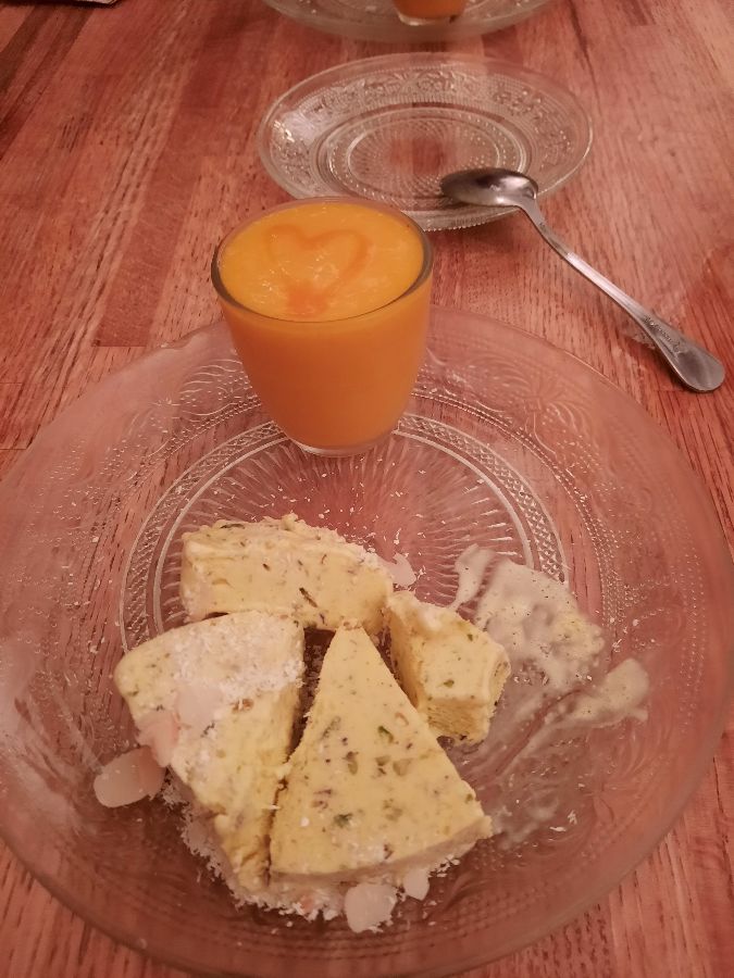 풍성한 식사의 대미를 장식하는 디저트 또한 Indian Aroma Madrid의 자랑입니다. 식사 후 제공되는 망고 스무디는 그야말로 신의 한 수입니다. 부드럽고 상큼한 맛에 완벽한 달콤함이 더해져, 묵직했던 입안을 개운하게 정화시켜 줍니다. 음료 위에 그려진 하트 문양은 작은 디테일에서 느껴지는 세심한 배려와 따뜻한 마음을 보여줍니다.