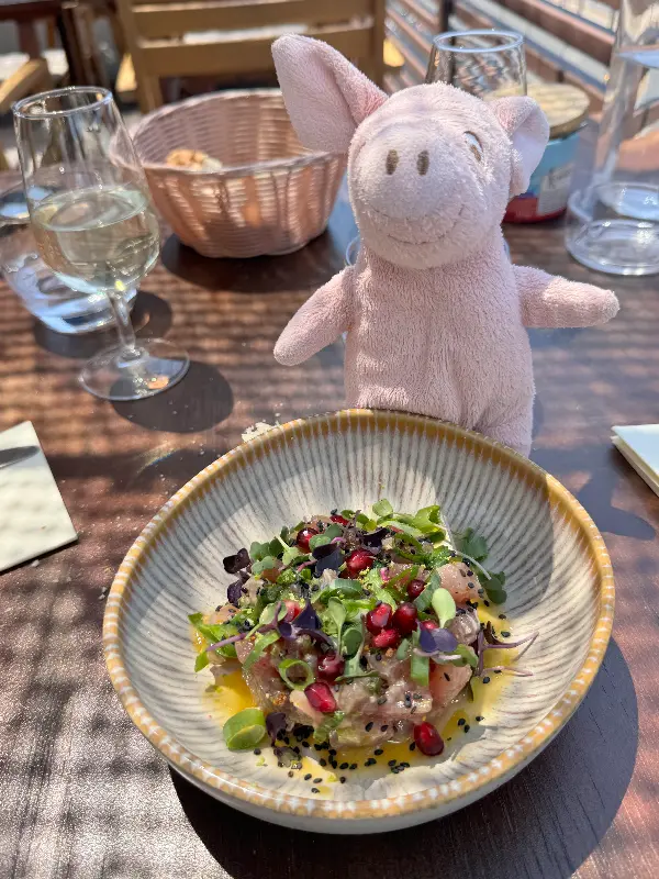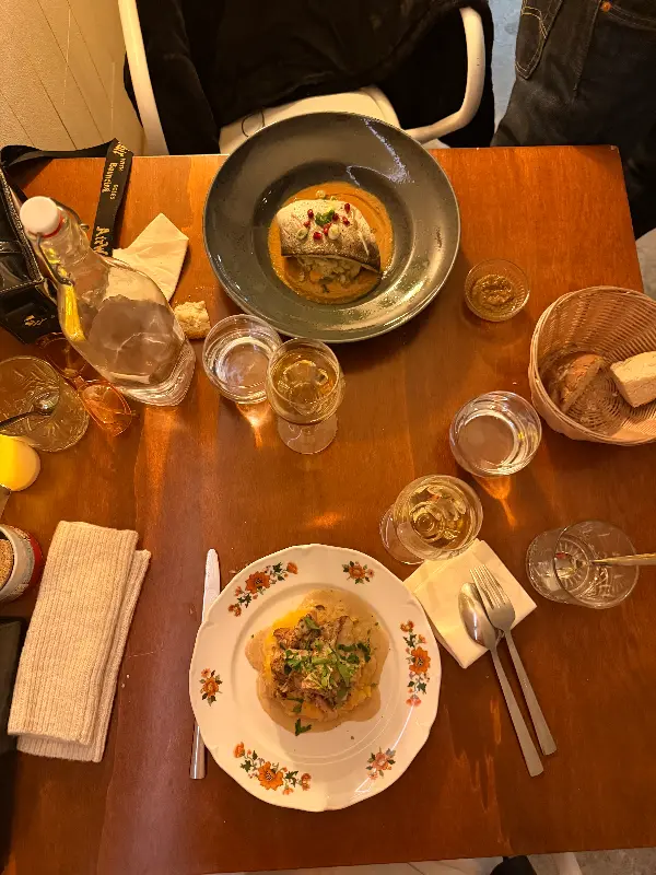 테이블 위에는 이미 보기 좋게 세팅된 식기들이 놓여 있었습니다. 햇살을 받아 반짝이는 와인잔과 은빛 커트러리, 그리고 따뜻한 색감의 나무 테이블은 레스토랑의 아늑한 분위기를 더욱 돋보이게 했습니다. 곧이어 등장한 빵 바구니에서는 갓 구운 빵의 고소한 향기가 코를 간지럽혔습니다.